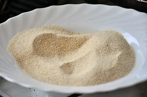 Обсмажування усуне алергенні властивості та надасть аромату. Викладіть манну крупу на тарілку, нехай остигає.