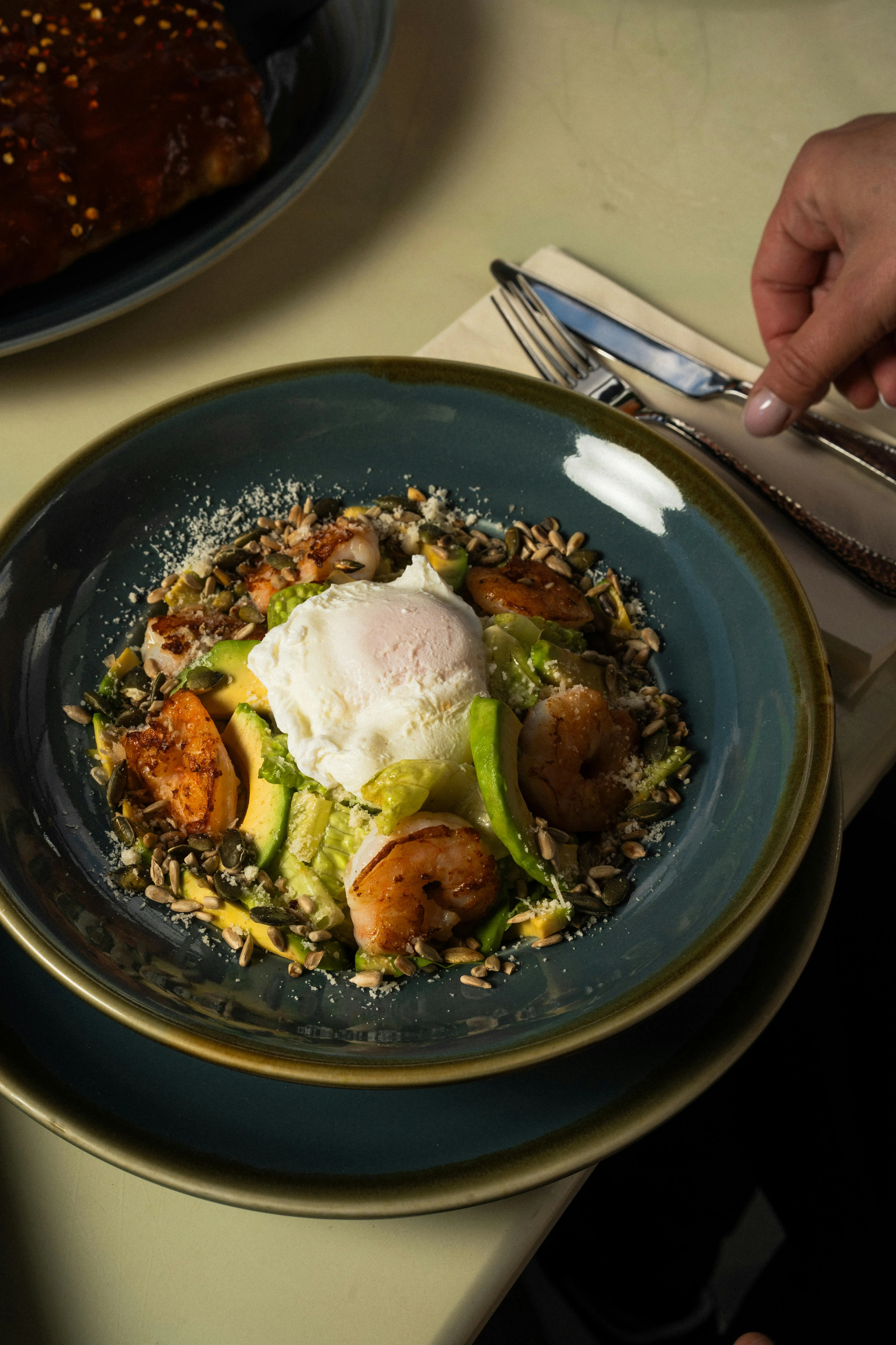 Перед подачею на тарілку викладаємо овочевий салат, зверху прикрашаємо шматочками омлету й гарячими креветками в клярі. Трохи свіжої петрушки і страва готова.