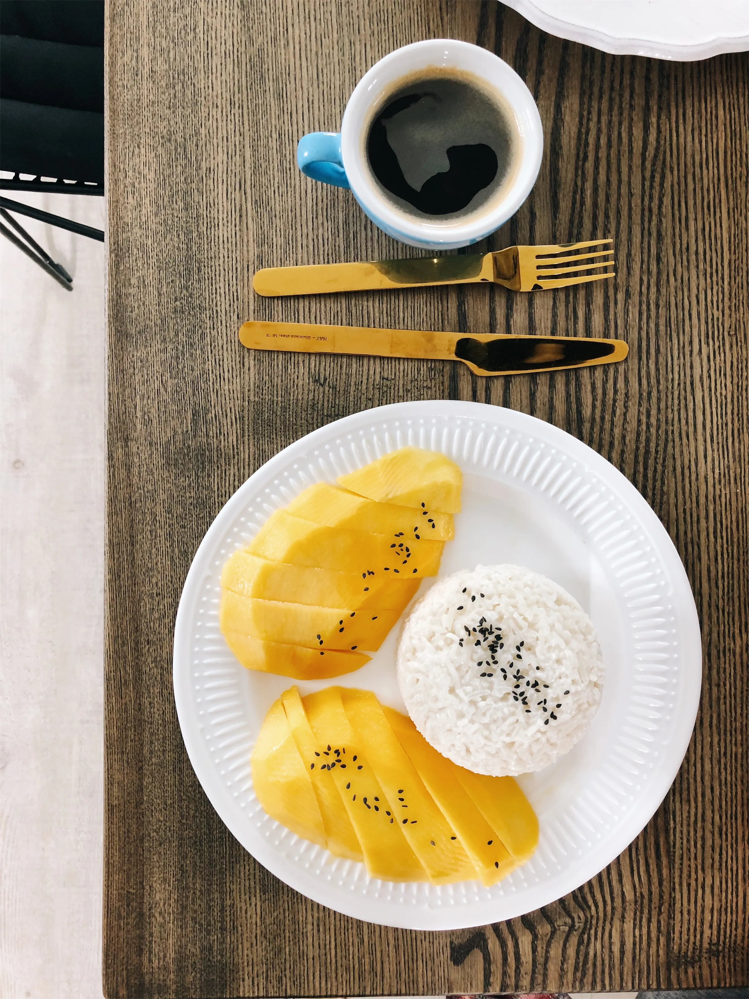 Класичний тайський сніданок та десерт. Мабуть, один із небагатьох рецептів, який присутній у всіх регіональних тайських кухнях і його можна зустріти на півночі, на півдні, на всіх островах і в глибині країни (той самий том ям чи пад тай — не скрізь). Основа — липкий рис, манго та кокосове молоко. Такий десерт їдять ложками, виделками та іноді навіть руками) Хелсі заклади стали готувати mango sticky rice на червоному, чорному та бурому рисі. І правильно роблять, такий рис корисніший, а розсипчастість білого тут не потрібна. Проте, даю класичний рецепт, із заміною липкого сорту рису на популярніший, але теж тайський. Для автентичності смаку.
