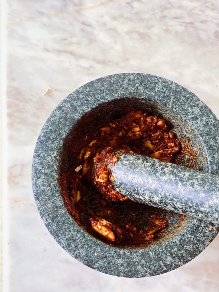 Часник почистити та видавити або розтерти у ступці з місо та сухим імбиром, перцем до однорідної кашоподібної текстури. Замаринувати тунець щонайменше на 20 хвилин, краще на 2-4 години.