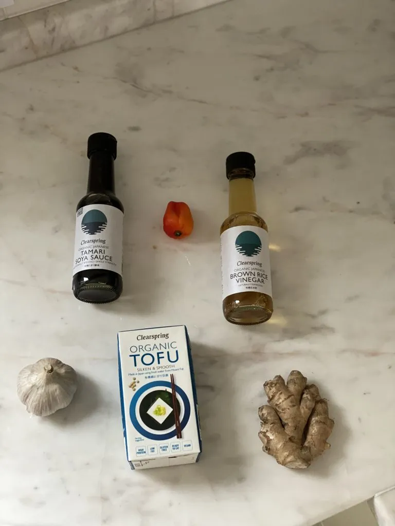 Злити воду з тофу, нарізати кубиками діаметром 2,5 см. Змішати інгредієнти маринаду в мисці й додати тофу. Переконайтеся, що маринад покриває весь тофу. Забрати в холодильник на 1-2 години мінімум.