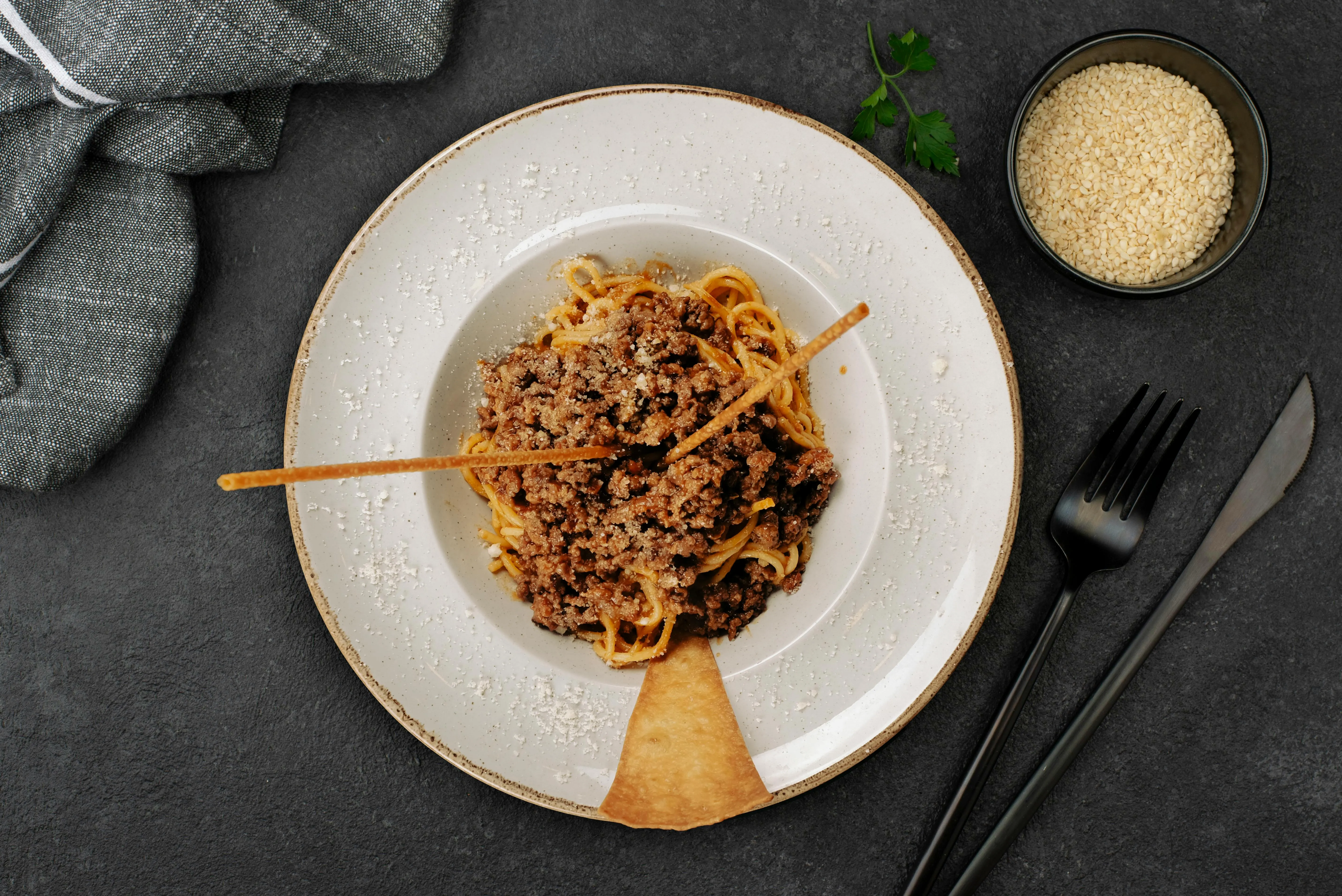 - Pasta with meat (spaghetti or tagliatelle, boiled meat, tomatoes, basil)