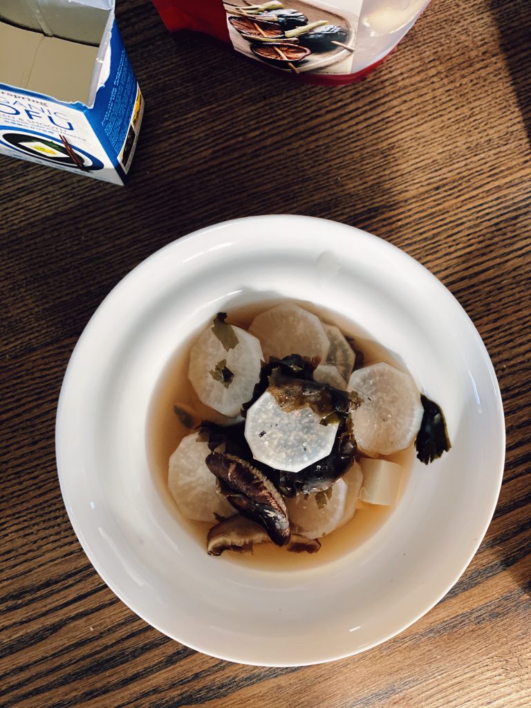Bring one liter of water to a boil and add 200 g of daikon and five fresh or dried shiitake mushrooms. Cook for twenty minutes, then add seven to ten pieces of dulse seaweed and simmer for another seven minutes. The broth can be left for up to two hours to let the mushrooms fully release their flavor. Before serving, remove the mushrooms, slice them thinly, and return them to the broth. The result is a clean, delicate, aromatic soup that is beautiful on its own, but can also be turned into a full meal by adding silken tofu, seafood, fish fillet, or boiled eggs.