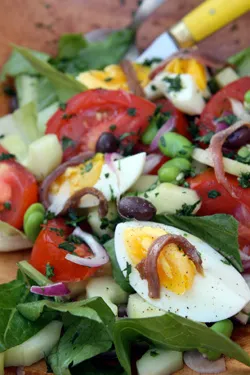 The combination of greens, anchovies, tomatoes, onions, and eggs is divine. And with the right dressing, it’s even better. During the off-season, I suggest replacing the basil in the dressing with 1 tbsp. of mustard. Recipe via the link.