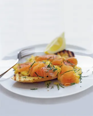 Melt butter in a frying pan. In a bowl, beat 4–5 eggs, add salt, and pour them into the pan. Cook for 3–4 minutes, stirring gently with a spatula. It is important to keep the eggs tender and soft. Toast a few slices of bread in a toaster or dry frying pan. Spread the scrambled eggs over the warm bread and top with a few pieces of smoked salmon (or replace with salted salmon). Serve with a slice of lemon for sprinkling, and finish by seasoning the scrambled eggs with freshly ground black pepper.