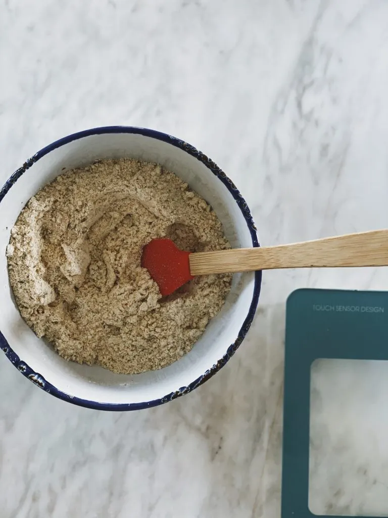 In a separate bowl, mix all dry ingredients: two types of flour, psyllium husk, salt, baking powder, dried garlic, and spices (my current favorite blend: amaranth flour + coconut flour + cumin + garlic + za’atar + sesame).
