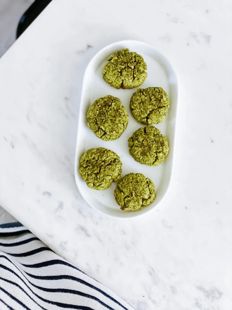 Mix all the ingredients together. Shape the dough into small balls about the size of a quail egg, flatten them slightly, and place them on a baking tray lined with parchment paper. Bake at 170°C for 12 minutes. Let them cool completely. To preserve the vibrant green color of the matcha, cover the cookies with an additional sheet of parchment paper during baking. And yes, you might want to double the ingredients from the start!