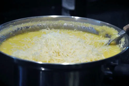 Grate the cheese and stir it into the polenta until melted and combined. The salt from the cheese may be sufficient, but taste and adjust if needed. If desired, add a bit of olive oil for a silkier texture.