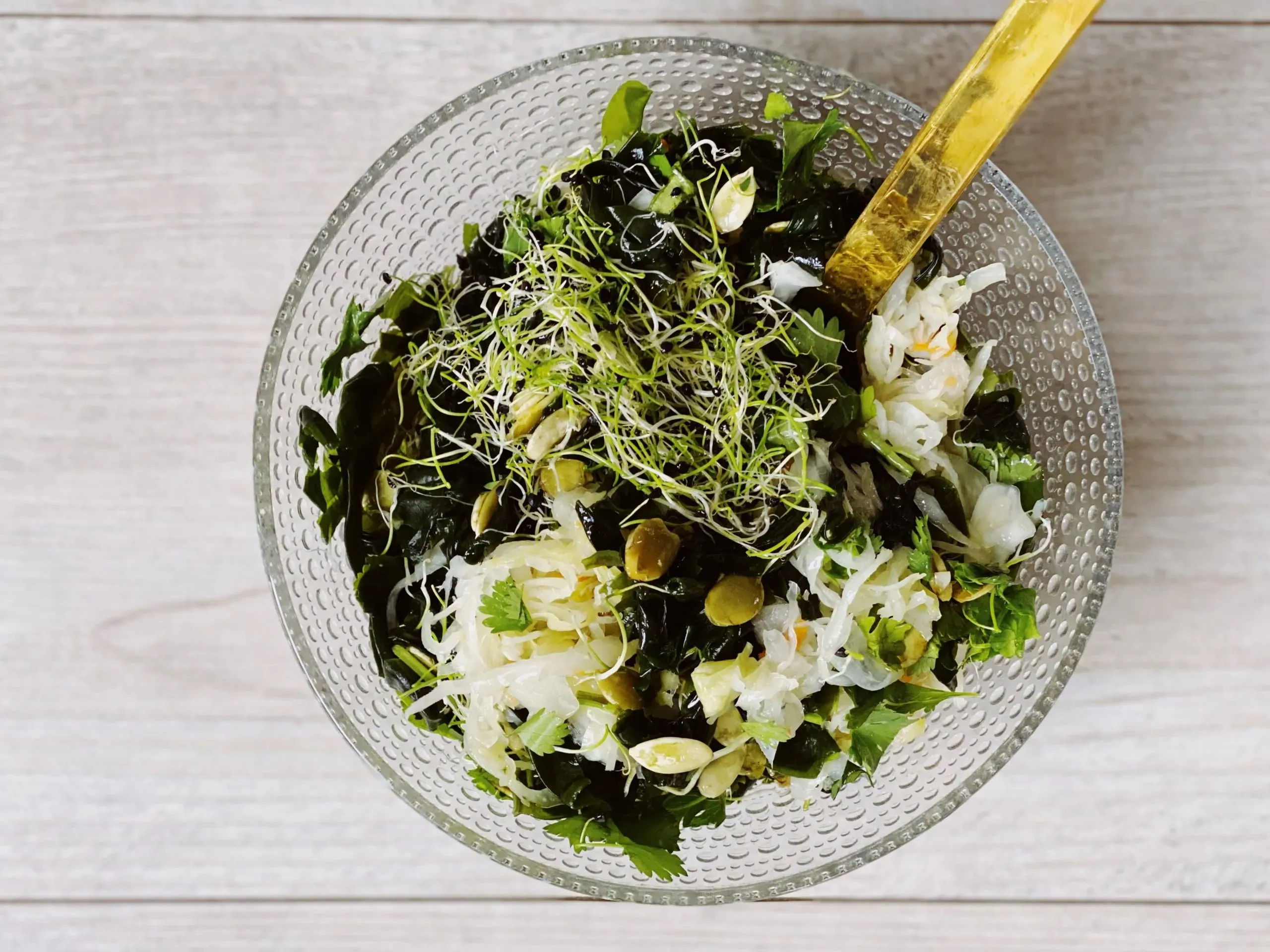 Soak the wakame in warm water for 2–5 minutes — seaweed doesn’t need much time to rehydrate. Meanwhile, finely chop the sprouts and sauerkraut. Drain the wakame, squeeze out excess water, and chop. Combine the seaweed, sauerkraut, and sprouts in a bowl. Drizzle with olive oil and sprinkle with pumpkin seeds. Add a generous amount of freshly ground black pepper if desired.