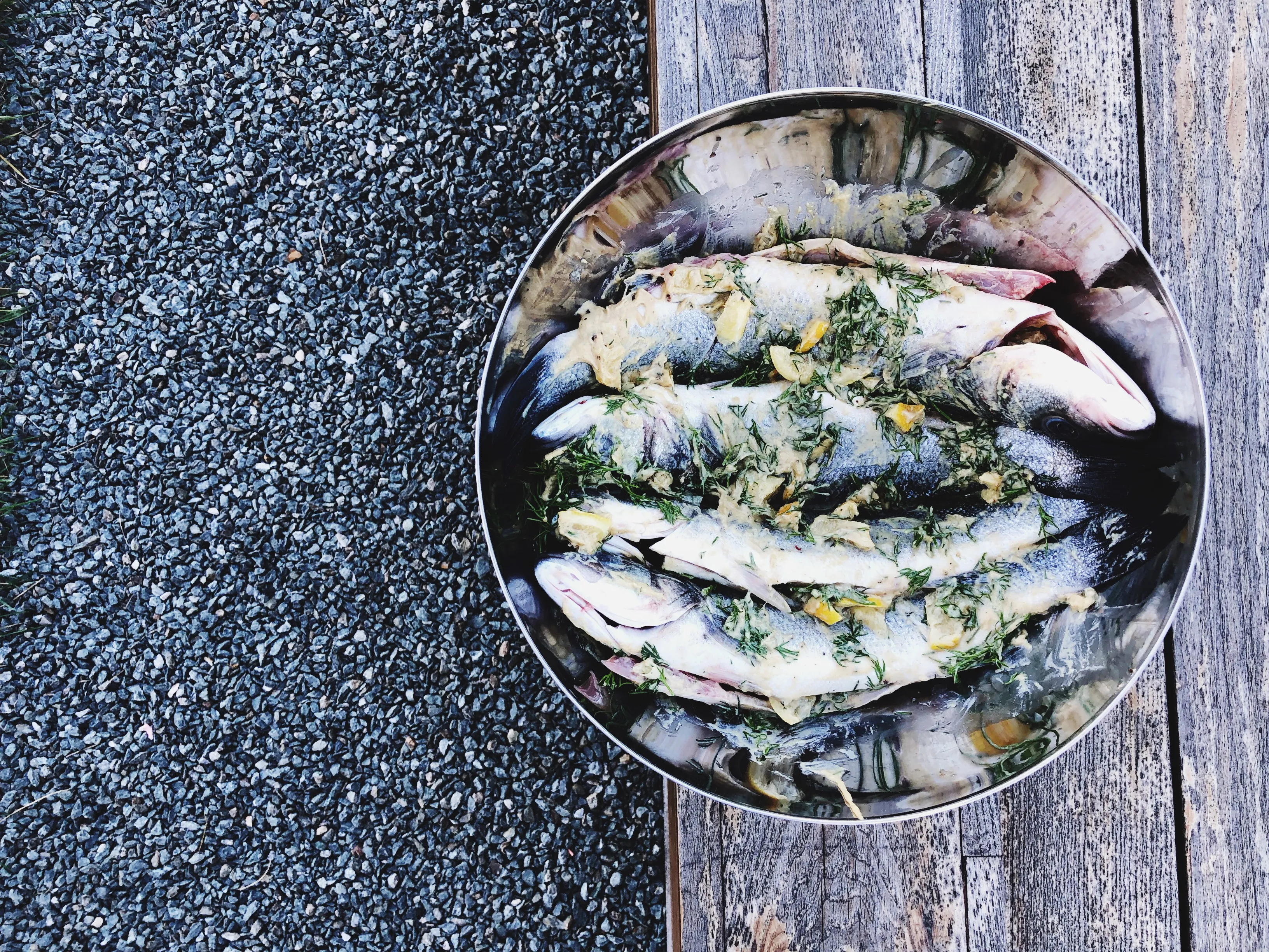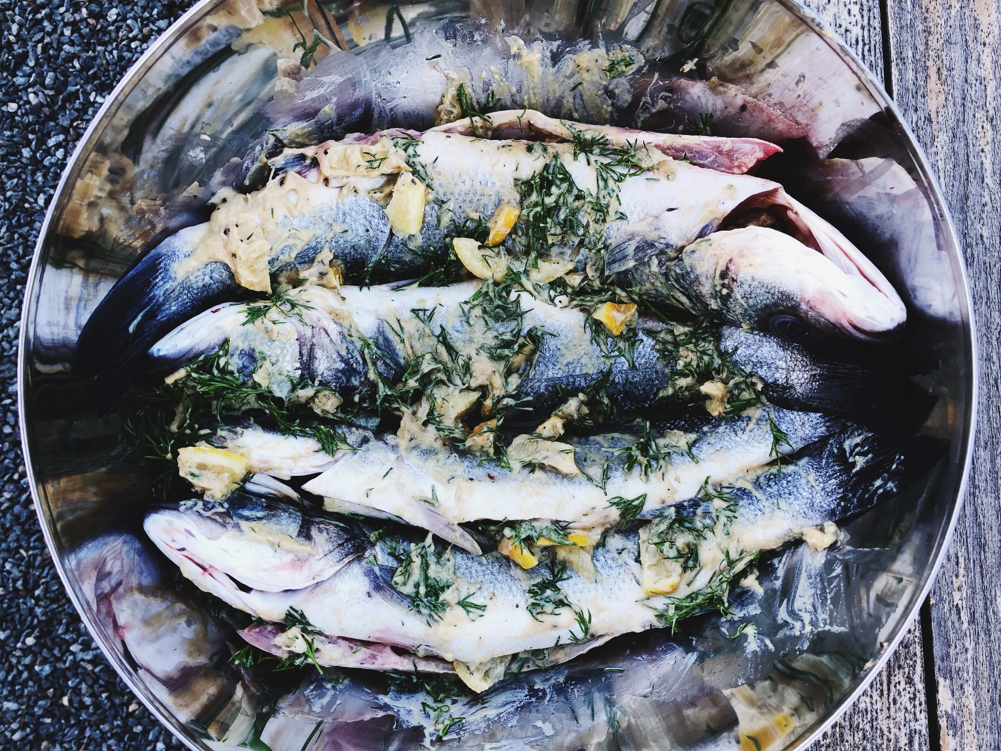 Скумбрії помити, витерти, видалити голови (у сибаса я залишаю) і зробити по 3-4 неглибоких надрізи з кожної зі сторін. Лимон розрізати навпіл і кожну половинку подрібнити тонкими скибочками 1-2 см завтовшки 2-3 мм. Кріп порубати. Рибу замаринувати в суміші гірчиці, кропу, шматочків лимона з цедрою, приправити сіллю та свіжомеленим чорним перцем. Змастити ретельно зверху, нафарширувати маринадом порожнисту начинку і трохи — в надрізи.