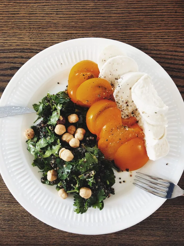 Відварити в підсоленій воді кіноа та амарант. Пропорції можна збільшити, тут у пропорції двох круп зовсім небагато. У цей час дрібно посікти улюблений набір зелені. Два види мінімум. Підійдуть: шпинат, фрізе, радічіо, молодий мангольд та кейл, рукола, м'ята, естрагон, кріп, петрушка, кінза, будь-яка улюблена свіжа та більше. Зелень змішати з відвареною кашею, заправити щедро маслом і трохи збризкати оцтом. Нарізати стиглий помідор, моцарелу, поруч покласти зелений мікс, приправити свіжомеленим чорним перцем і фундуком.