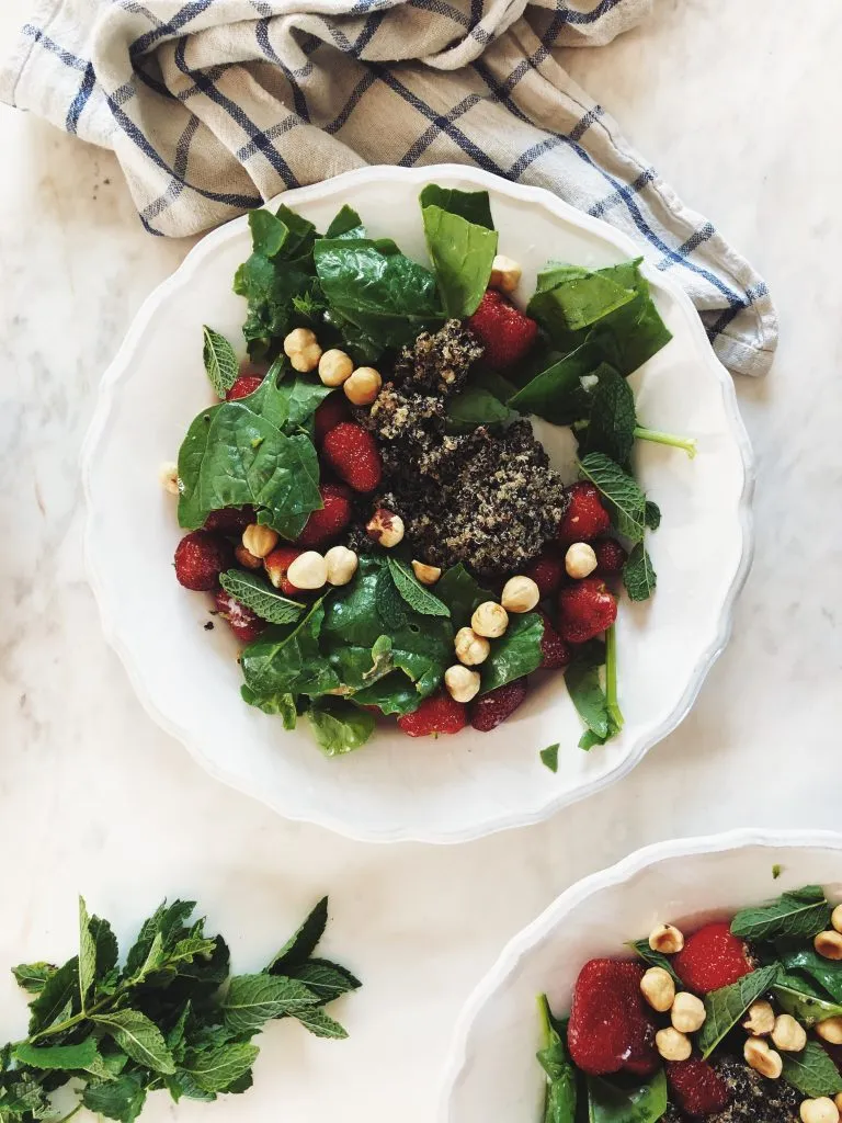 Салат з полуницею, м'ятою, шпинатом та фундуком