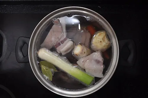 У каструлю кладемо м’ясо, коріння, 1 цибулю, лавровий лист і запашний перець, заливаємо водою, солимо і готуємо на невеликому або середньому вогні щонайменше 3 години (а краще і всі 4).