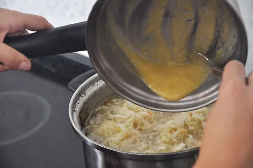 Повертаємо м’ясо, слідом за ним кладемо віджату капусту, 1 цибулю, даємо закипіти, зменшуємо вогонь і варимо 30 хвилин. У цей час у сотейнику розтоплюємо вершкове масло, акуратно помішуючи, всипаємо борошно, даємо трохи покипіти на невеликому вогні, розмішуємо і додаємо в щі.