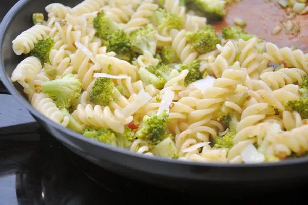 Особливо ніжні види пасти (наприклад, яєчні orecchiette (вушка), навіть стануть трохи зеленими). Зливаємо воду, в якій варилася паста та броколі, залишивши невелику кількість у каструлі. Змішуємо пасту та броколі з приготовленою в сковороді заправкою. Додаємо ще трохи вершкового масла.