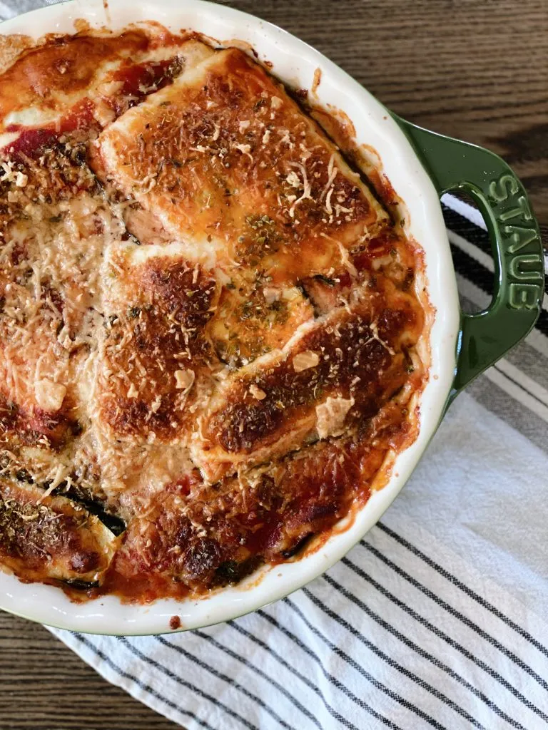 У форму для запікання викладати шари: шар запечених цукіні, шар сиру, тонкий шар пасати, щедро посипати орегано сухим, посолити, збризкати маслом. Шар цукіні, шар молодого м'якого сиру, тонкий шар пасати, орегано, сіль, збризкати олією. Залежно від форми, виходить 3-4 шари. Верхній шар закінчити пасатою, орегано і зверху засипати натертим на тертці пармезаном. Запікати при 170°C без гриль-режиму від 40 до 60 хвилин (залежить від форми та товщини форми). Верхній шар має бути золотистого кольору.