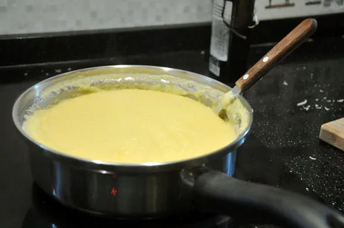 Якщо вам вдалося знайти поленту швидкого приготування, вона буде готова вже через 2 хвилини (якщо взяли звичайну кукурудзяну крупу, її потрібно поварити близько 20-30 хвилин, періодично помішуючи). Коли каша буде готова, додаємо 1/3 вершкового масла. Перемішуємо.