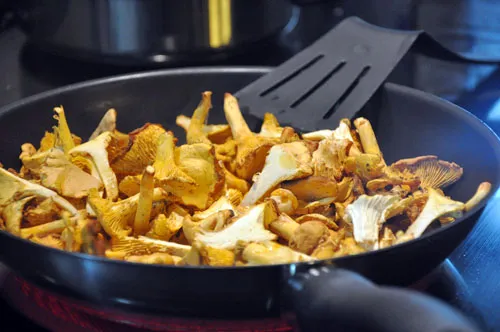 Кладемо гриби (якщо замочували, віджати та крупно порубати, далі за рецептом). Вони швидко вберуть масло, але ми їх обсмажуємо з усіх боків, щоб вони трохи підрум’янилися і пішов інтенсивний грибний запах. Якщо бачите що необхідно — додавайте ще трохи олії. Але небагато, щоб вони не тушкувалися в ньому.