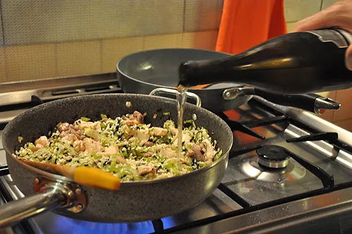 Помішуючи, чекаємо кілька хвилин, поки вино випарується. Тепер додаємо бульйон. Холодний бульйон, як на фото, дозволяється лише при першому додаванні, далі температуру ризото не можна знижувати. Тому весь залишок бульйону ми розігріваємо.