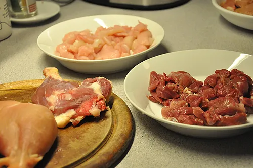Знімаємо м’ясо з кістки та нарізаємо його невеликими кубиками. Нарізаємо селеру, шалот півкільцями, часник дрібно.