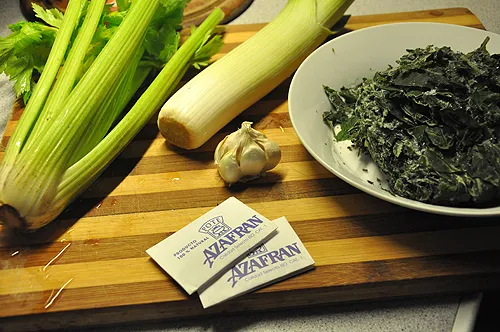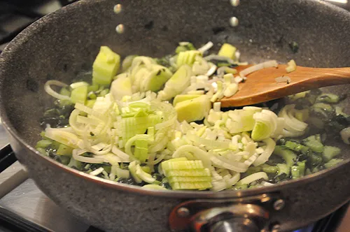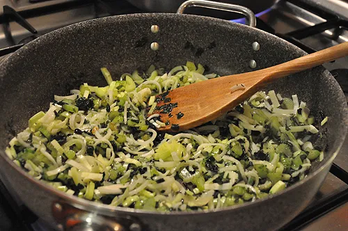 У глибокій пательні на оливковій олії злегка обсмажуємо селеру, часник і базилік до розм’якшення.