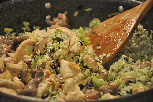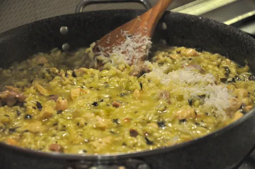 Тепер це один з улюблених рецептів ризото. Можна використовувати як дичину, так і домашню качку. Або зробити, як ми — взяти половину м'яса качки, половину домашньої курки.