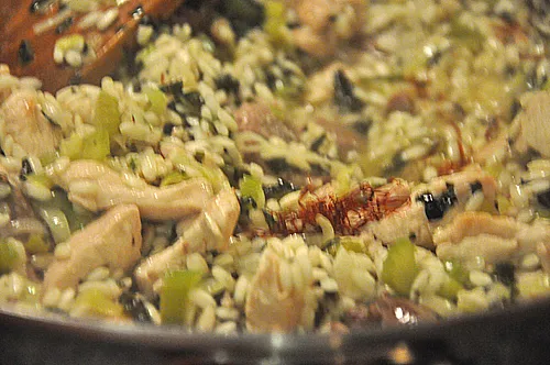 Додаємо шафран, який миттєво забарвить ризото в жовтий колір. Далі чекаємо, поки бульйон випарується, перемішуємо, вливаємо ще половник теплого бульйону, знову перемішуємо і чекаємо, поки випарується. Цей процес займе близько 10–15 хвилин.