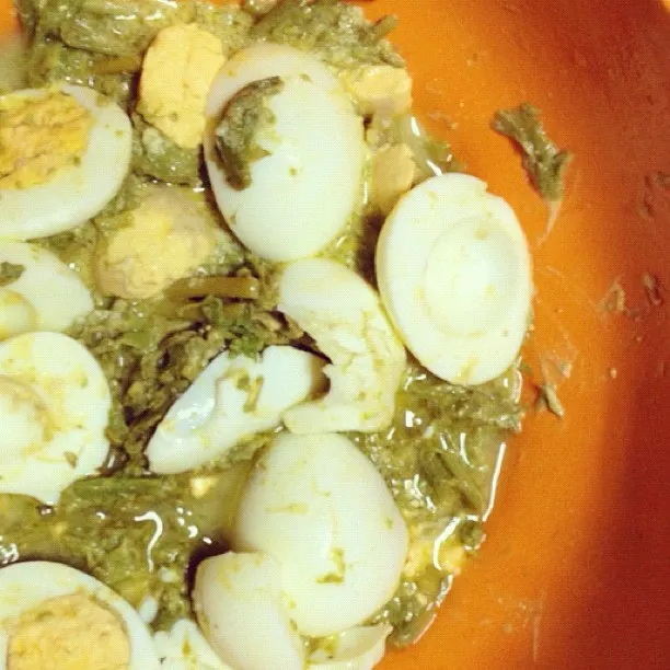 Відварюємо яйця. Спаржу ріжемо або ламаємо шматками близько 3-4 см. У сковороді розігріваємо оливкову олію, кидаємо спаржу, солимо, припускаємо, вливаємо трохи води й гасимо 5-7 хвилин, поки спаржа не розм'якшиться. Для заправки змішуємо частина оцет і частини олії, добре збовтуємо до однорідності. Варені яйця розрізаємо навпіл, додаємо спаржу, заправляємо отриманою сумішшю.