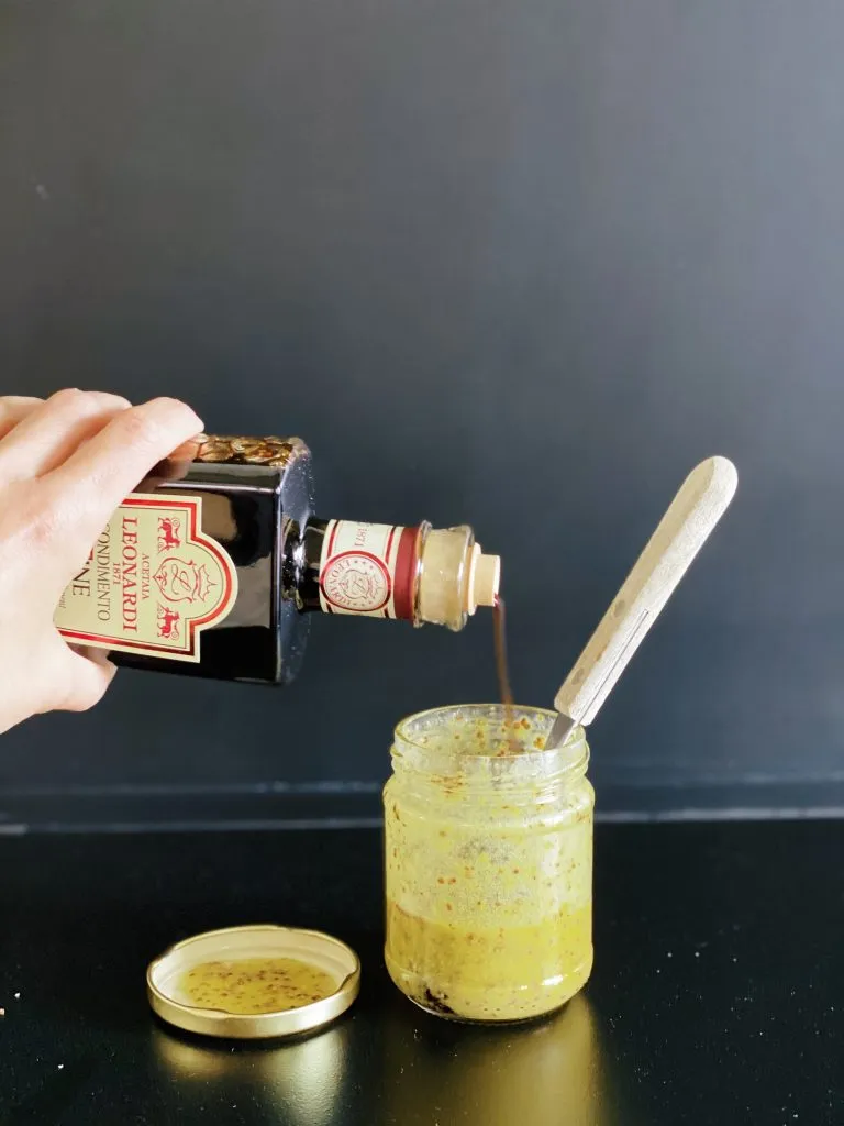 Змішати до однорідного стану бальзамічний оцет та гірчицю. Влити оливкову олію та ще раз ретельно перемішати. Загалом цього вже достатньо, але я люблю робити цей варіант більш перченим: додаю ще щедру порцію свіжомеленого чорного перцю. Молотого кимось заздалегідь, в упаковці — ніколи, свіжомеленого з перцевого млина або ступки  — тактактак. Третій варіант вінегрету — крім основних інгредієнтів, перед подачею в заправку додати 1/2 чашки подрібненого смаженого фундука.