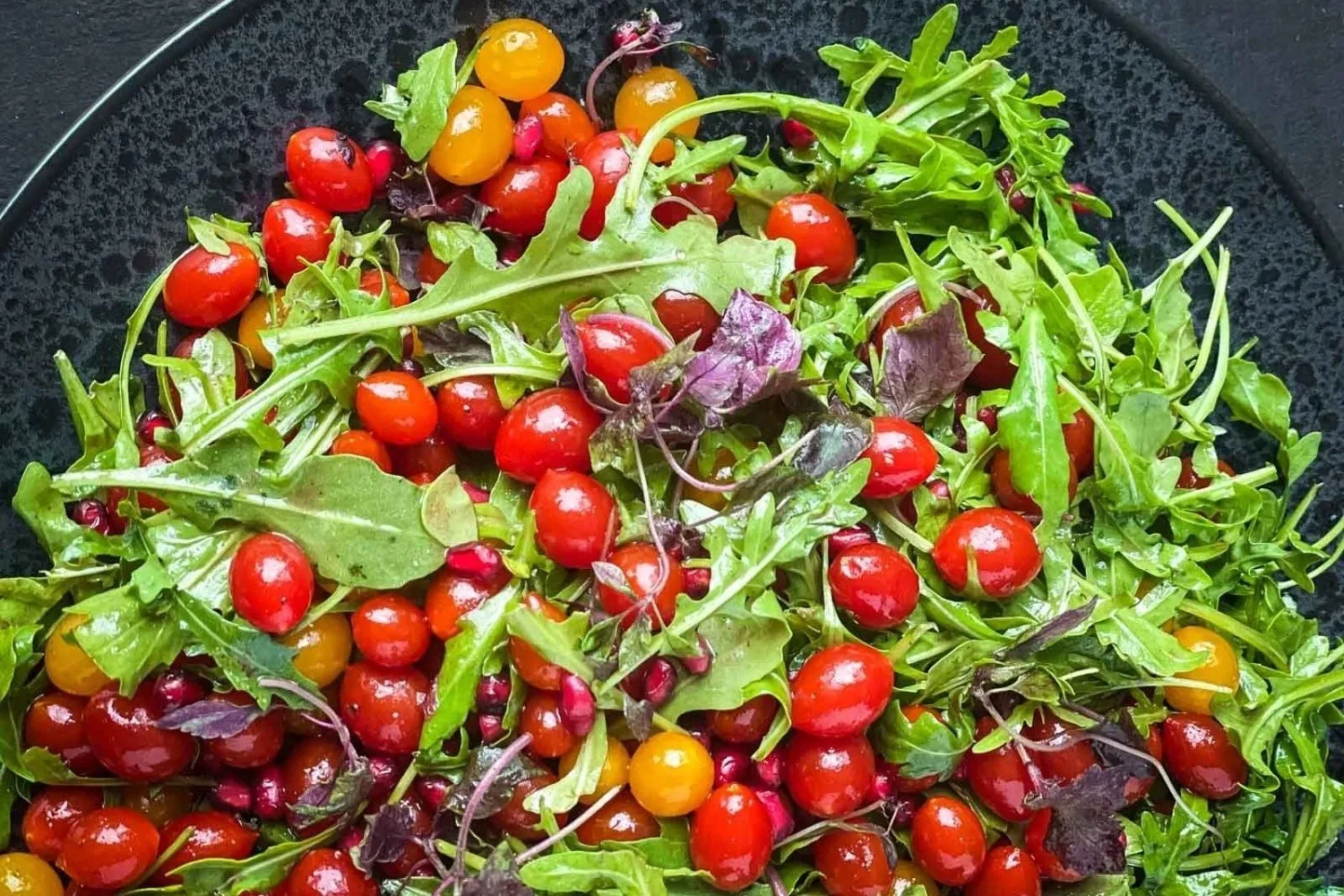 Ріжемо томат, яйце, зверху куряче м'ясо, руколу і заправляємо гірчичною заправкою, що вийшла. Все. Загальний час приготування — 3 хвилини. Те ж може трапитися з бужениною, м'ясом у вині, рибою, та чим завгодно. Експериментуємо, додаємо м'ясо або рибу в пасту, на брускети чи, як у цьому прикладі, салати.