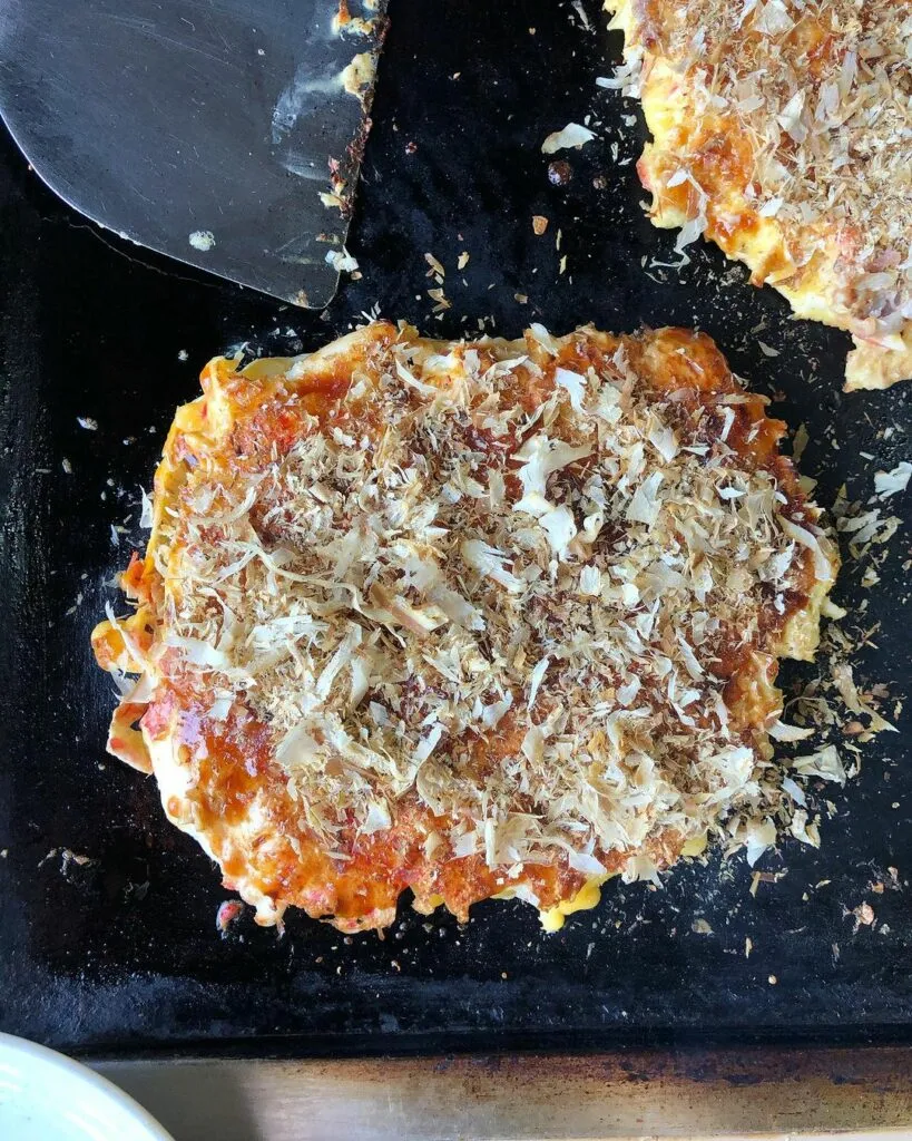 Сьогодні ще раз про яйця та сніданки, під новим кутом. Японський омлет-панкейк, в топ-3 страв японського стріт-фуду. Японці (та корейці) досі їдять рибу та її субпродукти як і раніше — цілими. Не тільки філе. Субпродукти риб, сіфуд, мʼясо з колагеном/шкіркою — вкрай поживна їжа. Тут на фото — з ікрою, рецепт готувала для платформи про рибу EASYFISH.